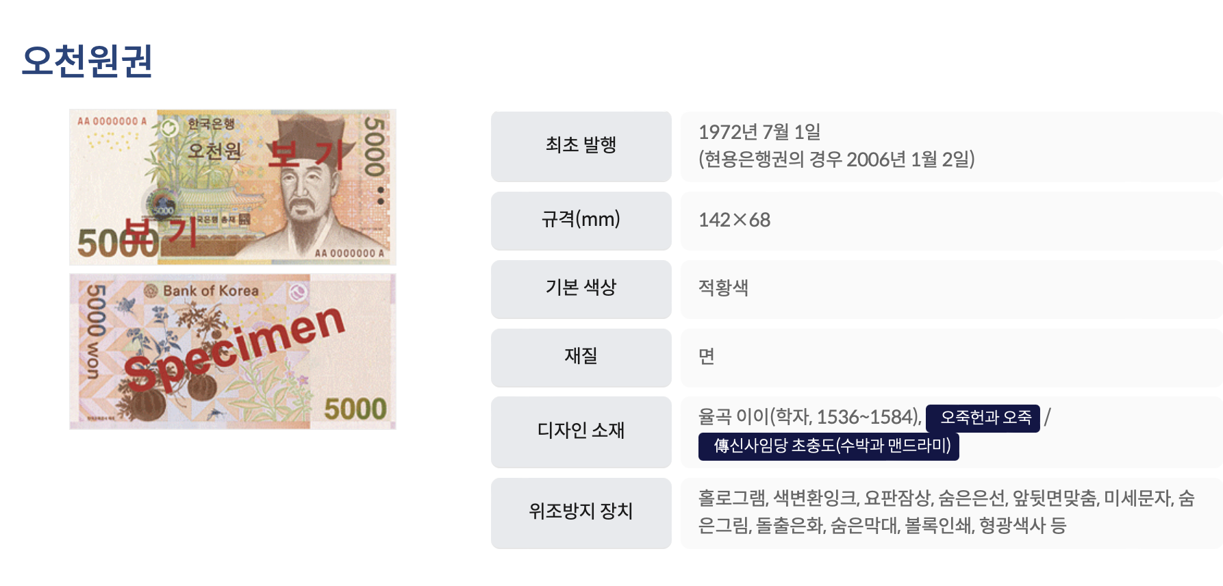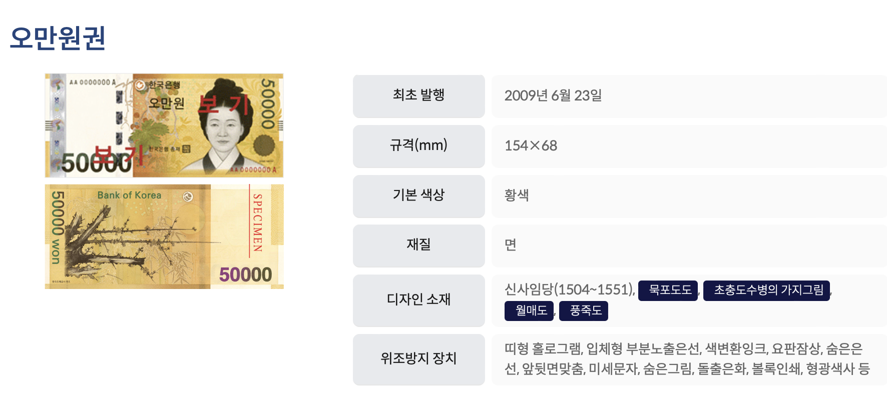 한국의 고액권이라는 점에서