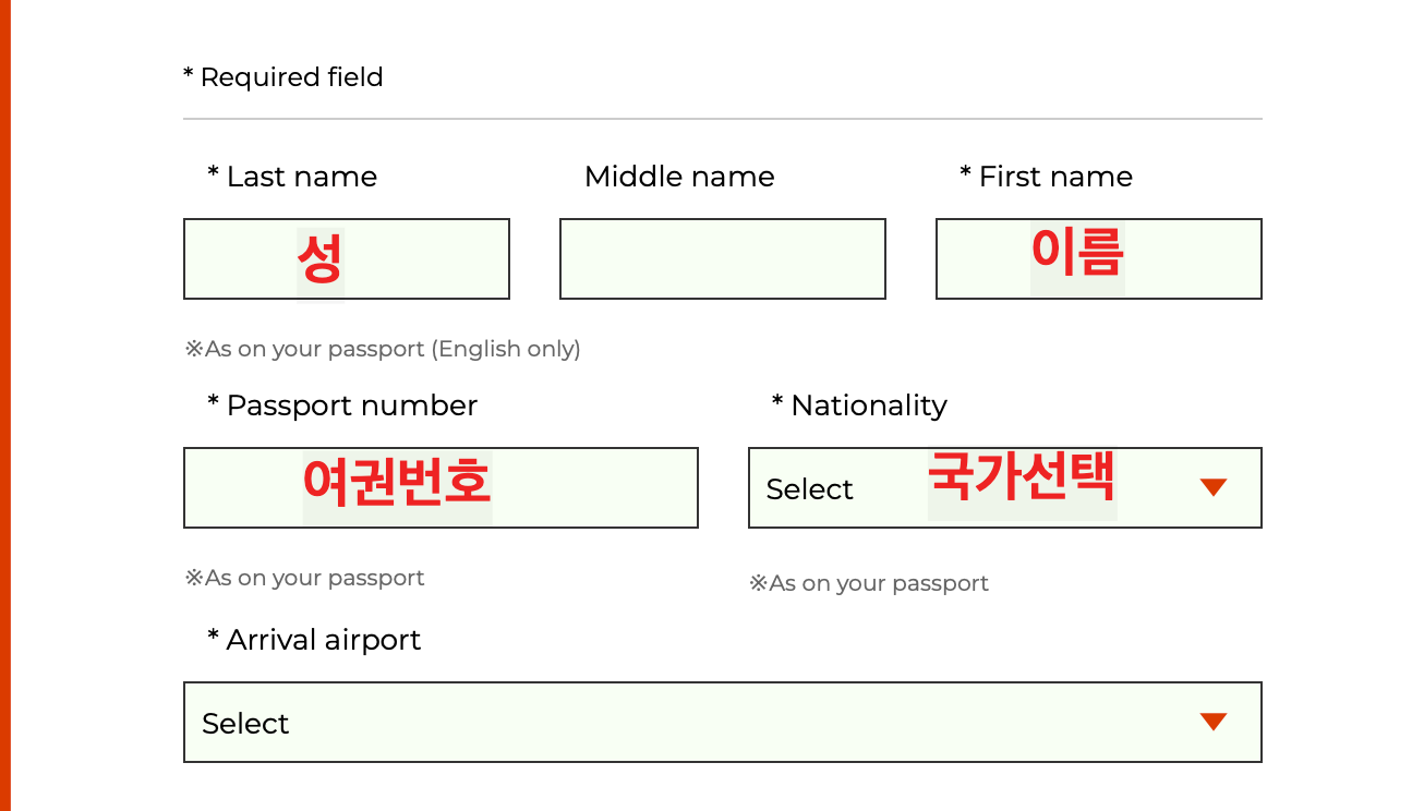 이름, 성, 여권번호, 국가 선택하면 됩니다.