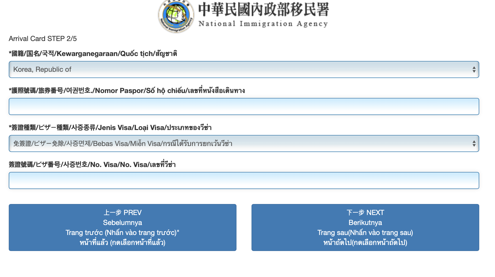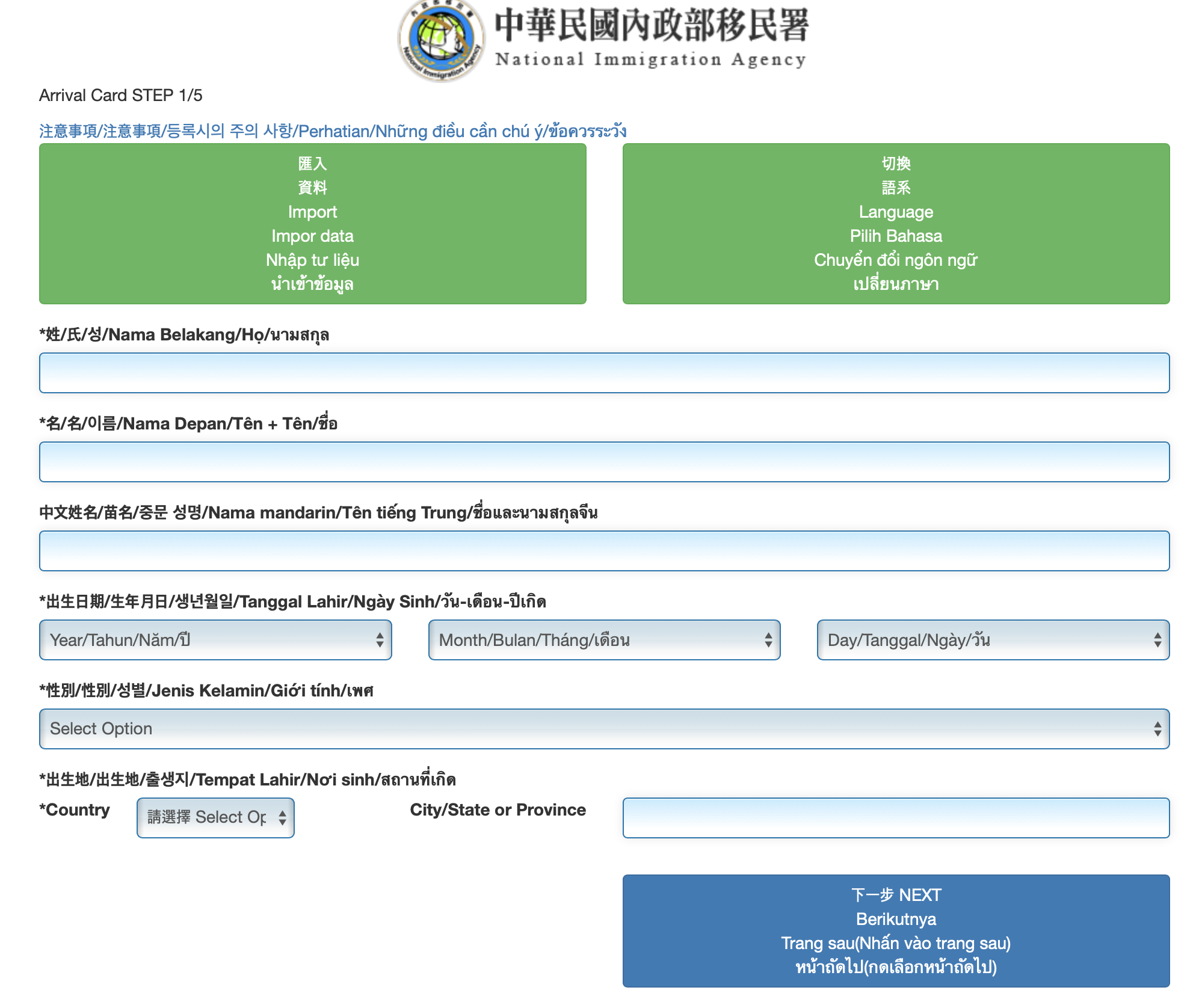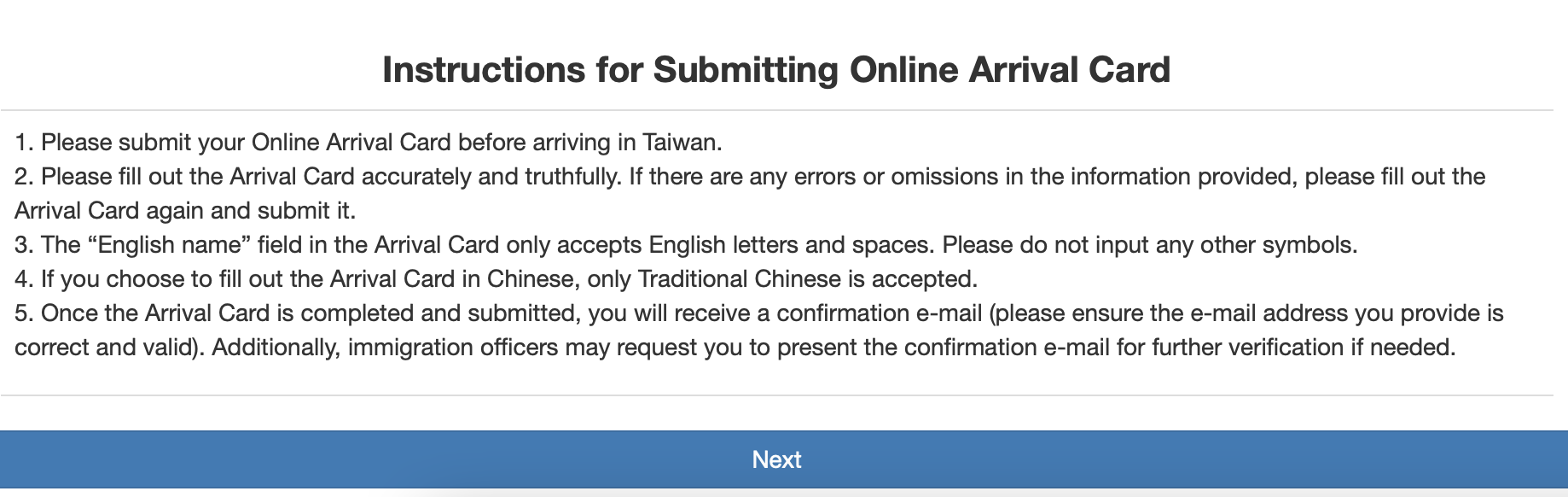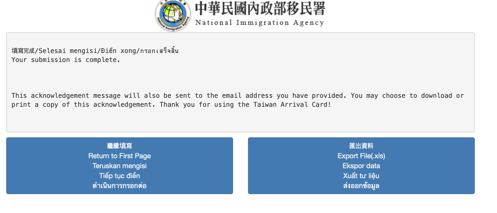 Harus menyelesaikan pengisisan sebelum memasuki Taiwan. Harus disisi dengan lengkap dan benar. Jika ada kesalahan, harus mengisi lagi dengan data yang benar. Kolom nama Inggris, hanya bisa diisi dengan alfabet Inggris dan karakter kosong (spasi). Jika meng