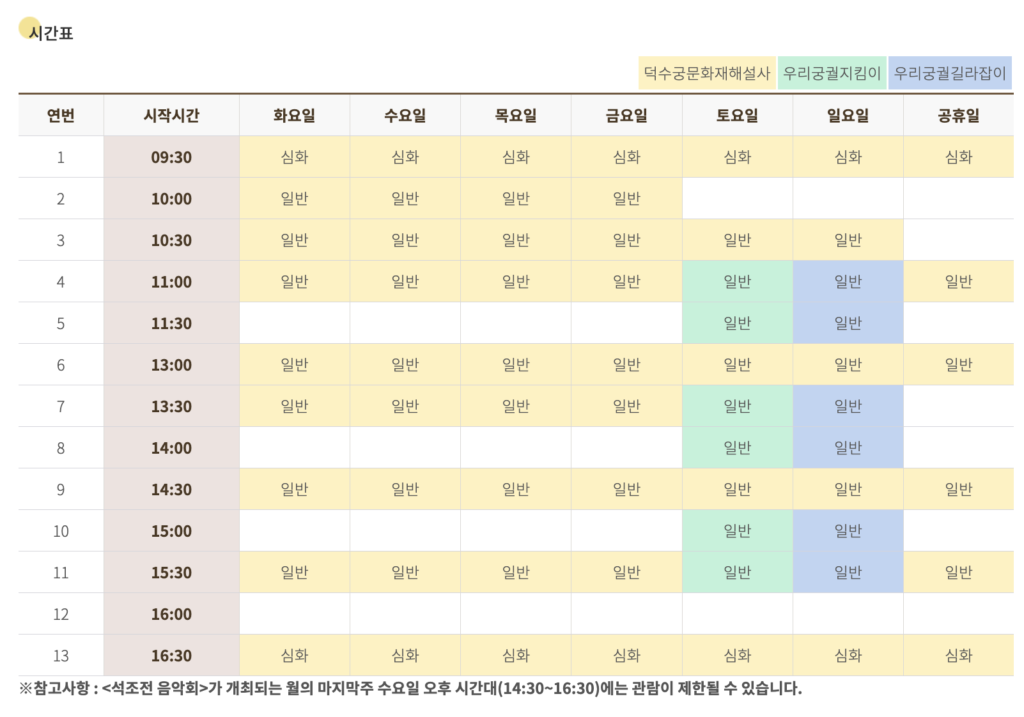 화요일부터 일요일 그리고 공휴일의 시간표를 참고하여 예약을 해야한다. 심화와 일반 중에 어떤 해설을 들을 것인지 선택하여 시간에 맞춰 방문해야한다. 예약확인은 예약자의 이름과 전화번호를 통해 확인하거나 혹은 접수증으로 확인이 가능하다.