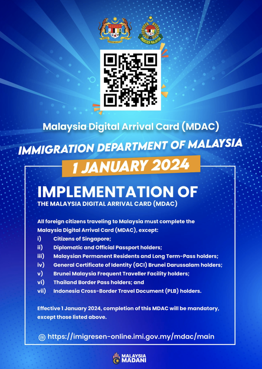 [중요] 말레이시아 입국전 디지털 입국카드(MDAC) 사전 등록 필요[12.06 수정 업데이트] 말레이시아 디지털 입국 카드(MDAC) 등록 시행일이 2024년 1월 1일 부터 시행 됩니다. [주요 변경 사항 ] - 시행