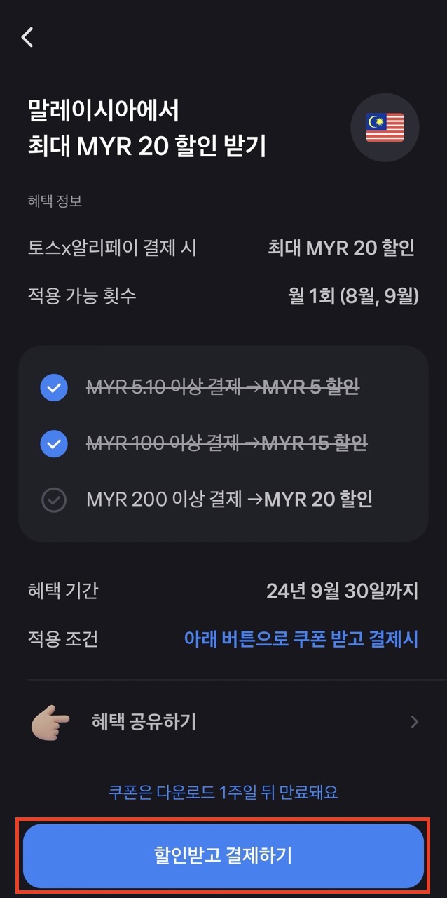 토스페이에는 200링깃이상 결제 20일깃할인이에요.